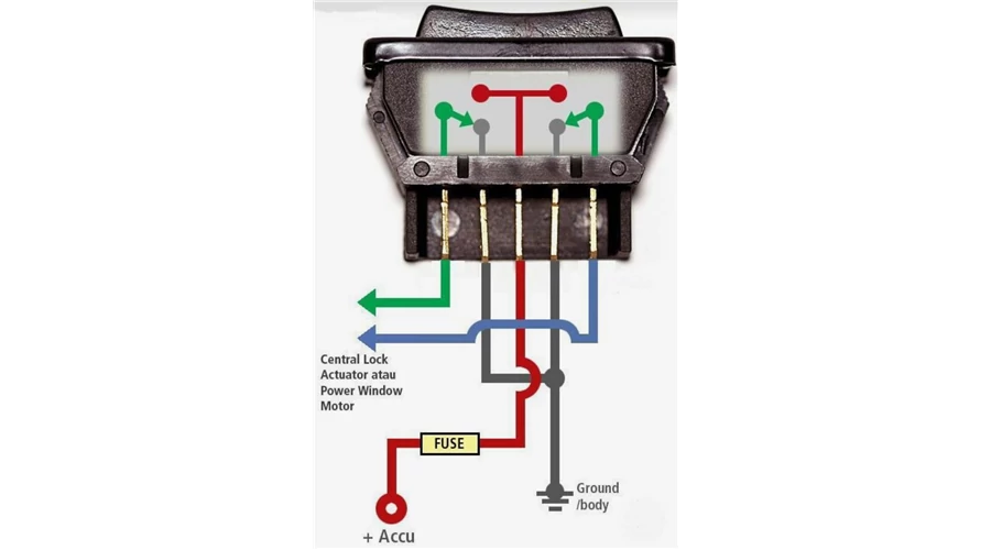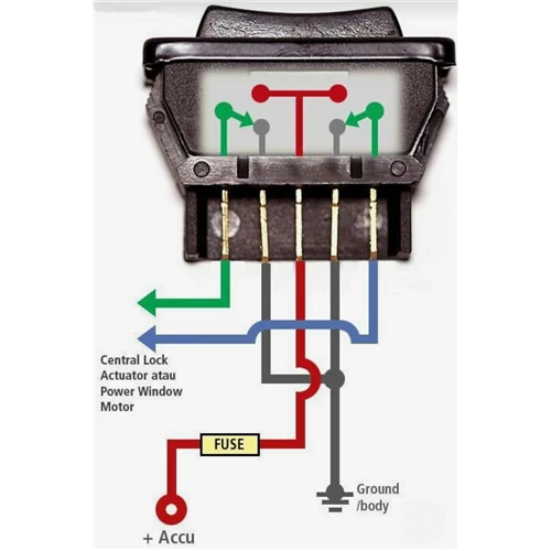 Billenő kapcsoló 40X20 két áramkör (ON)-OFF-(ON) 12V/20A 5 láb ablakemelő