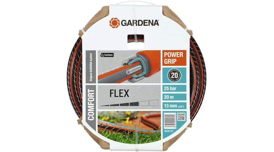 A GARDENA Comfort FLEX tömlő Power Grip bordázattal tökéletes csatlakozást biztosít a tömlő és a tömlőelem között. Az új technológiának köszönhetően egymásba illenek, mint a fogaskerekek. A Power Grip bordázat lehetővé teszi sok kerttulajdonos régi álmát; a megbízható kapcsolatot, tökéletes tartóerővel. A bordázott felület pozitív mellékhatása, hogy a tömlőt könnyebb feltekerni és jól csúszik. A spirálhálós szövetnek köszönhetően, melyben két spirálszál egymással ellentétes irányban fut, a tömlő nyomásálló és alaktartó, egyúttal rugalmas és könnyen kezelhető. Ez nyújtja a legjobb előfeltételeket az egyszerű és sokoldalú felhasználáshoz a kertben. Szükség esetén az Original GARDENA System csatlakozóelemeihez és öntöző eszközeihez kitűnően használható. Nem tartalmaz káros lágyítókat (ftalátokat) és nehézfémeket és természetesen UV ellenálló. Vastag fala különösen robusztussá és tartóssá teszi. 25 bar repesztő nyomás. 20 év szavatosság.