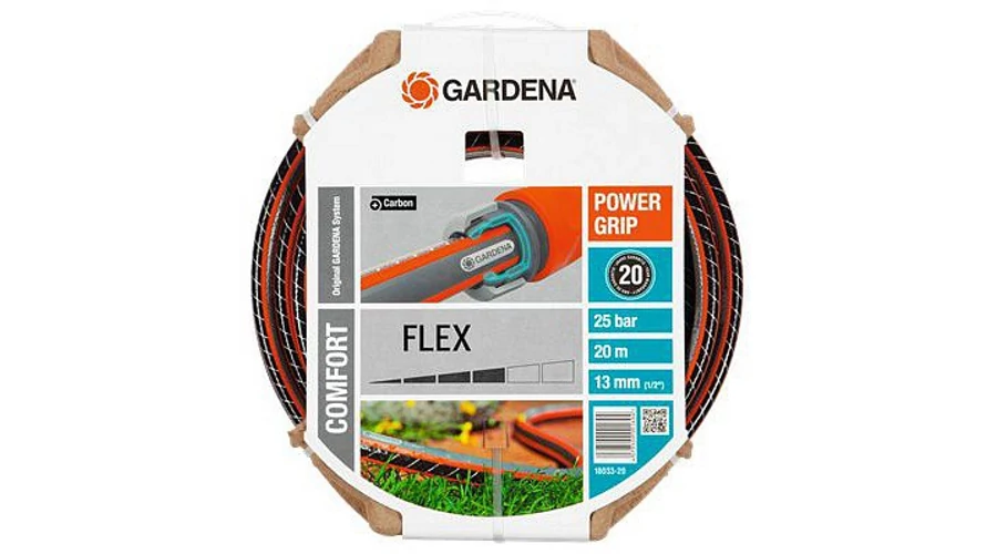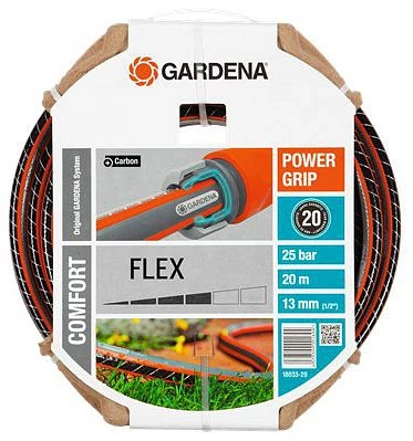 A GARDENA Comfort FLEX tömlő Power Grip bordázattal tökéletes csatlakozást biztosít a tömlő és a tömlőelem között. Az új technológiának köszönhetően egymásba illenek, mint a fogaskerekek. A Power Grip bordázat lehetővé teszi sok kerttulajdonos régi álmát; a megbízható kapcsolatot, tökéletes tartóerővel. A bordázott felület pozitív mellékhatása, hogy a tömlőt könnyebb feltekerni és jól csúszik. A spirálhálós szövetnek köszönhetően, melyben két spirálszál egymással ellentétes irányban fut, a tömlő nyomásálló és alaktartó, egyúttal rugalmas és könnyen kezelhető. Ez nyújtja a legjobb előfeltételeket az egyszerű és sokoldalú felhasználáshoz a kertben. Szükség esetén az Original GARDENA System csatlakozóelemeihez és öntöző eszközeihez kitűnően használható. Nem tartalmaz káros lágyítókat (ftalátokat) és nehézfémeket és természetesen UV ellenálló. Vastag fala különösen robusztussá és tartóssá teszi. 25 bar repesztő nyomás. 20 év szavatosság.