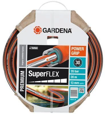A GARDENA Premium SuperFLEX tömlő Power Grip bordázattal tökéletes csatlakozást biztosít a tömlő és a tömlőelem között. Az új technológiának köszönhetően egymásba illenek, mint a fogaskerekek. A Power Grip bordázat lehetővé teszi sok kerttulajdonos régi álmát; a megbízható kapcsolatot, tökéletes tartóerővel. A bordázott felület pozitív mellékhatása, hogy a tömlőt könnyebb feltekerni és jól csúszik. A sűrű, kiváló minőségű spirálhálós szövetnek köszönhetően, melyben két spirálszál egymással ellentétes irányban fut, a tömlő kiemelkedően nyomásálló és alaktartó, egyúttal a GARDENA legrugalmasabb tömlője. Ez a spirálok sűrűségének köszönhető, ami a tömlőt még rugalmasabbá és könnyebben kezelhetővé teszi. A tömlő nem csomózódik vagy csavarodik. Mindezek a legjobb előfeltételeket nyújtják az egyszerű és sokoldalú felhasználáshoz a kertben. Szükség esetén az Original GARDENA System csatlakozóelemeihez és öntöző eszközeihez kitűnően használható. Nem tartalmaz káros lágyítókat (ftalátokat) és nehézfémeket és természetesen UV ellenálló. A szennyeződésnek ellenálló, átlátszó külső tömlőbevonat védi. Vastag fala különösen biztonságossá, robusztussá és tartóssá teszi. 35 bar repesztő nyomás. 30 év szavatosság.