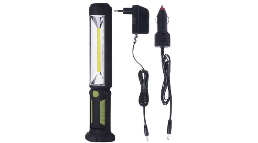 Univerzális, műanyag, újratölthető COB LED-es munkalámpa otthonra, a műhelybe vagy bárhová, ahol nagyobb területet kell megvilágítani. A lámpa figyelmeztető LED-háromszöggel, praktikus kampóval és mágnessel rendelkezik a felakasztáshoz és hálózati adapterrel az autós és a hagyományos aljzathoz.